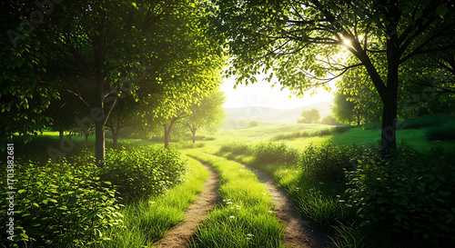 © Toriqul, Fototapeta premium Scenic Countryside Path Through Lush Green Fields and Trees on a Sunny Day Discovering Nature
