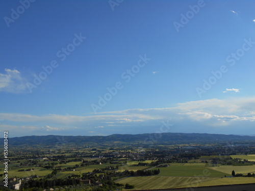 Fototapeta premium イタリア・アッシジの田園風景と遠くに続く山並み|青空と広大な大地が広がる美しい風景 Scenic countryside view of Assisi,...