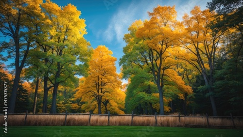 © GenZGraphics, Fototapeta premium Scenic countryside with majestic trees, golden grasses, and a vibrant autumn sky