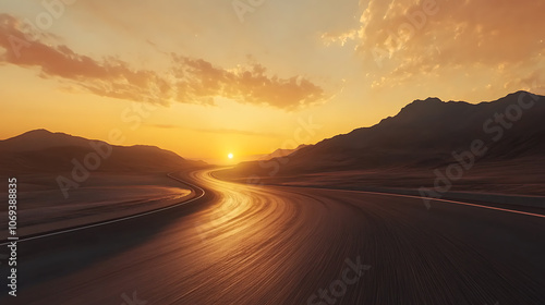© CreativeCreations, Fototapeta premium Scenic curved highway asphalt road with golden sky and mountain in the sunset