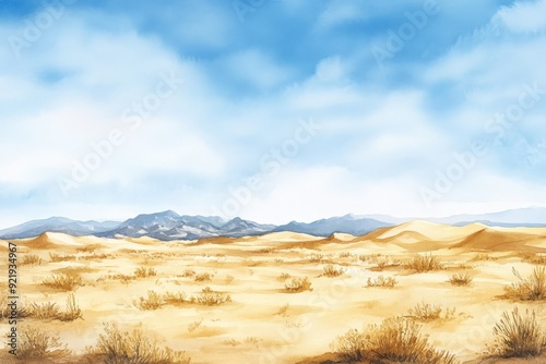 © arhendrix, Fototapeta premium Scenic desert landscape under a bright blue sky with mountains in the background, showcasing natural beauty and tranquility.