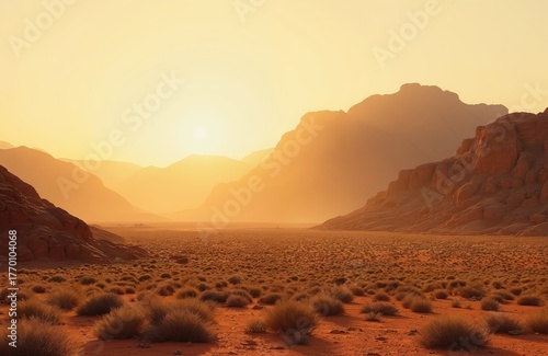 © Viktor, Naklejka premium Scenic desert landscape with mountains during sunset. Red sand plain with sparse vegetation. Arid rocky hills at golden hour. Warm light bathes the desert in orange hues.