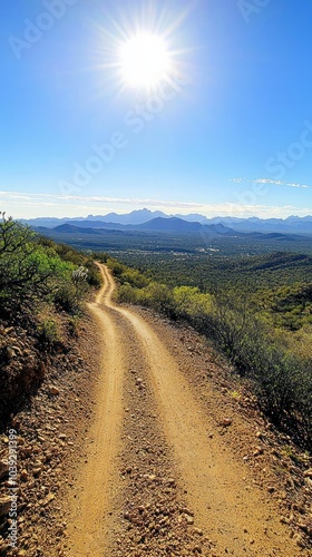 Naklejka premium Scenic Desert Trail Beneath a Bright Sun with Mountain Views in the Distance