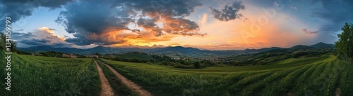 © Muhammad, Obraz premium Scenic dirt road at sunset, fields, mountains