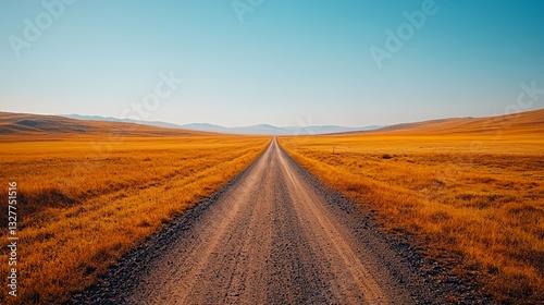 © Serhii Hryb, Fototapeta premium Scenic Dirt Road Stretches Through Golden Grassland Under Blue Sky in a Tranquil Landscape During Late Afternoon Light