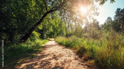 © Joker Art, Fototapeta premium Scenic dirt road surrounded by lush green trees and vibrant grass under a bright sunlit sky
