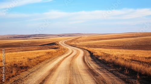 © samrit, Fototapeta premium Scenic Dirt Road Winding Through Golden Fields Under Clear Blue Sky in Expansive Countryside Landscape