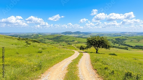 © danadesa, Obraz premium Scenic dirt road winding through lush green field under blue sky