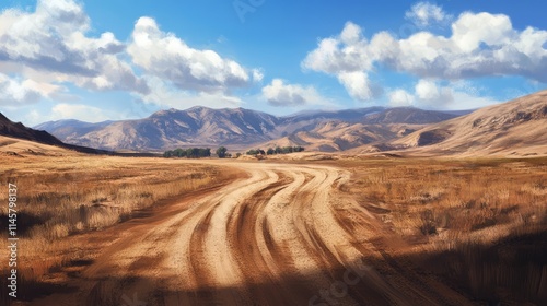 Naklejka premium Scenic dirt track winding through a semi-desert valley with mountains and...
