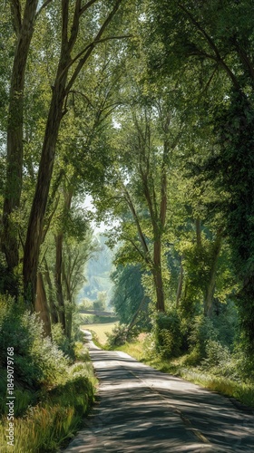 Obraz premium Scenic Drive Down a Long Country Road Lined With Green Trees and Grass