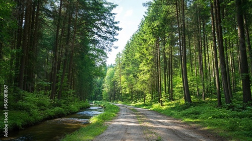 Fototapeta premium Scenic drive through pine forest with a river running parallel