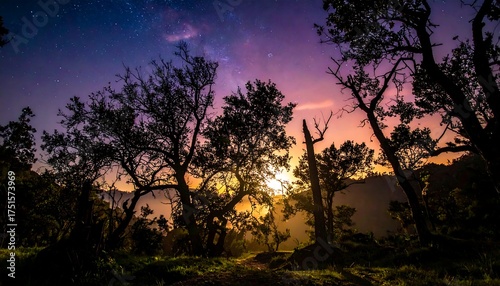 © darwin, Fototapeta premium Scenic dusk shot with tree silhouettes under a starlit sky
