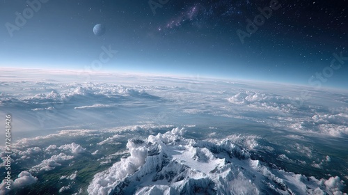 Fototapeta premium Scenic Earth View from Space with Blue Planet Light Atmospheric Perspective and Cloudscape Mountain Peaks and Celestial Starry Background
