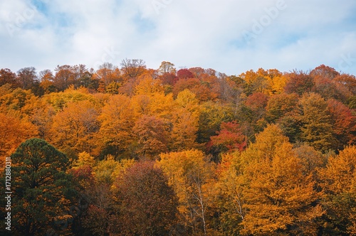 Fototapeta premium Scenic fall vista with golden leaves and vibrant red foliage in a peaceful...