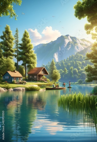 Naklejka premium scenic family fishing trip lake fishing rods boat nature, outdoors, leisure,...