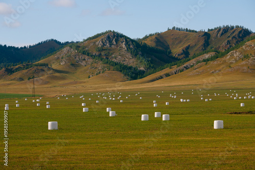 © Parilov, Obraz premium Scenic farm landscape with hay bales on rolling hills under blue sky