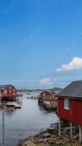 Fototapeta premium Scenic fishing village A in Lofoten Islands with authentic fishermen sheds...