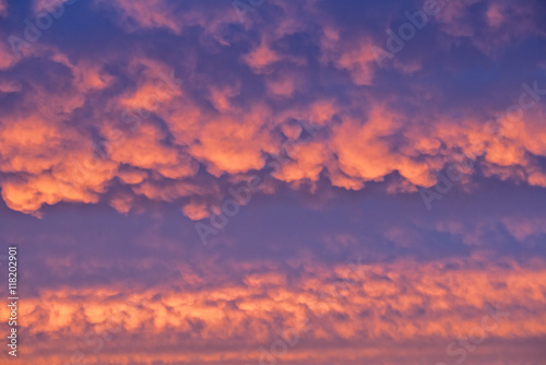 © Belozorova Elena, Obraz premium Scenic flaming clouds at sunset scarlet-pink.