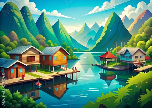 Naklejka premium Scenic Floating Village in Lush Green Mountains Under a Clear Blue Sky - Tranquil Nature Escape, Serene Landscape, Idyllic Waterside Community, Peaceful Retreat, Vibrant Illustration