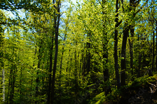 © maria, Fototapeta premium Scenic forest of fresh green deciduous trees framed by leaves, with the sun