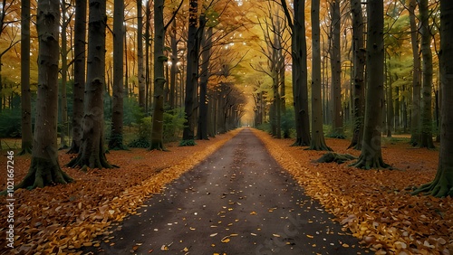 © Artem, Obraz premium Scenic Forest Path Covered in Autumn Leaves: Peaceful Fall Walk Through Nature