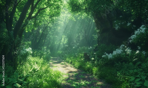 © Valentyna, Obraz premium Scenic forest path illuminated by dappled sunlight filtering through dense greenery, creating a peaceful and natural ambiance