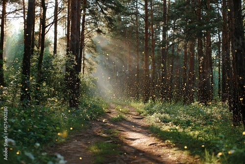 Fototapeta premium Scenic forest path illuminated by golden morning sunlight streaming through...