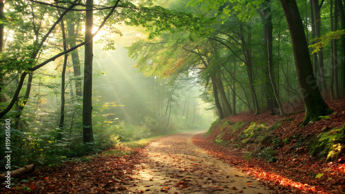 © AngelinArt, Obraz premium Scenic forest path illuminated by sunlight with colorful autumn leaves