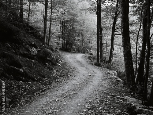 Naklejka premium Scenic Forest Path in Monochrome: Nature's Tranquility and Outdoor Adventure