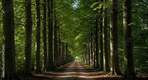 © jervinjerkaeffmason, Obraz premium Scenic Forest Path Perspective View through Tall Trees in Summer