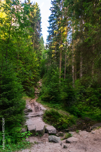 Fototapeta premium Scenic forest path surrounded by lush greenery, sunlight filtering through trees, perfect for hiking