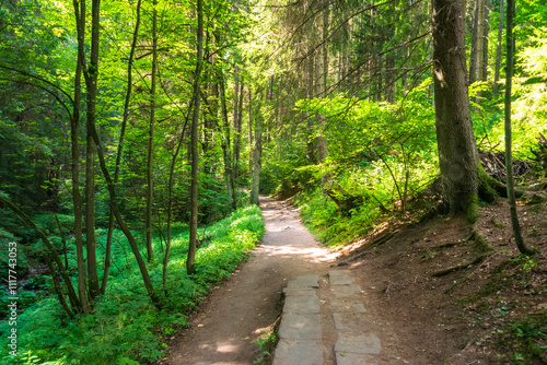 Obraz premium Scenic forest path surrounded by lush greenery, sunlight filtering through...