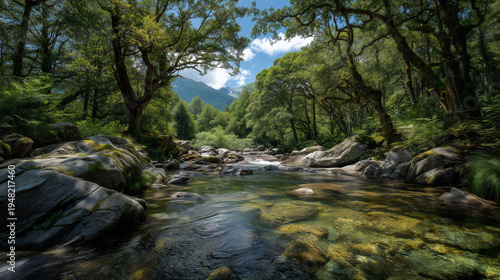 Obraz premium Scenic Forest River, crystal clear water running through a forest, creating a...