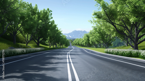 © Qstock, Fototapeta premium Scenic Forest Road Landscape Illustration with Mountain View and Lush Greenery