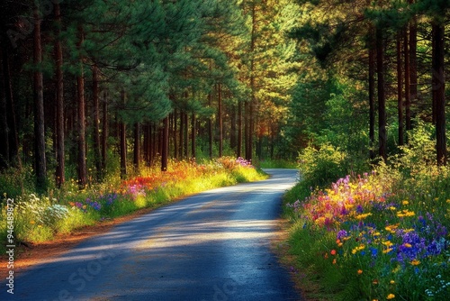 © JackBoiler, Fototapeta premium Scenic Forest Road with Vibrant Wildflowers and Pine Trees in Bloom