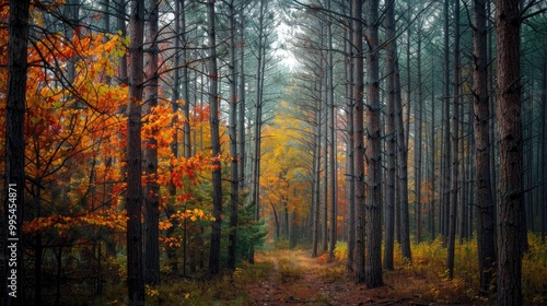 © NeuralNiche, Fototapeta premium Scenic forest with tall trees and colorful leaves