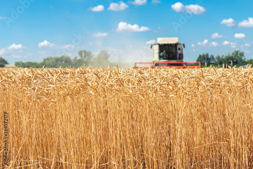 © Kirill Gorlov, Fototapeta premium Scenic front view Big powerful industrial combine harvester machine reaping golden ripe wheat cereal field on bright summer or autumn day. Agricultural yellow field machinery landscape background