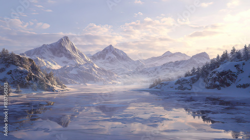 © Sayada, Fototapeta premium Scenic frozen lake under soft morning light with snow on transparent background