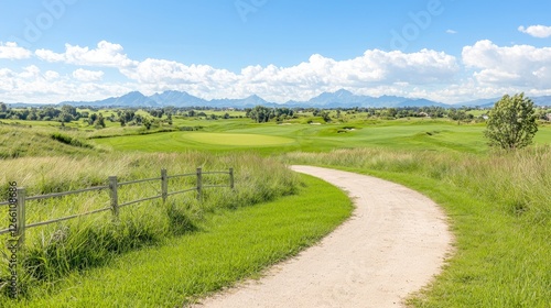 Fototapeta premium Scenic golf course path, mountains, summer