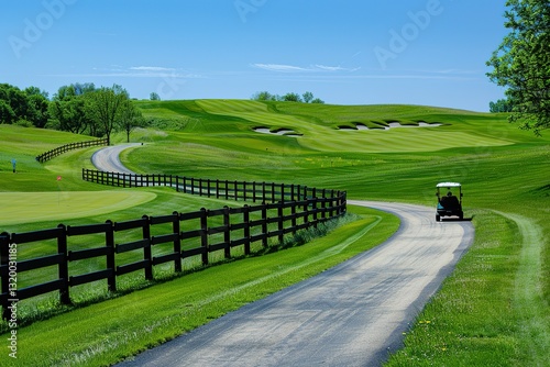 © Rayhanbp, Obraz premium Scenic golf course with green fairways sand traps and a meandering cart path
