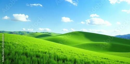 Fototapeta premium Scenic green grassland landscape with rolling hills and clear blue sky,...