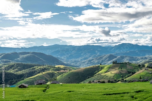 © Jame, Fototapeta premium Scenic Green Hills Under Blue Sky Landscape