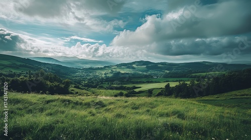 Obraz premium Scenic green landscape under cloudy sky with peaceful nature view