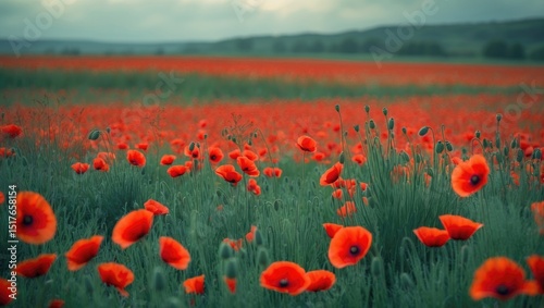 Obraz premium Scenic Green Landscape with Blooming Red Poppies in Cornwall