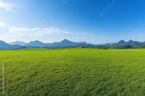 © bocheng, Fototapeta premium Scenic Green Meadows Under Bright Blue Sky with Majestic Mountains in the Background