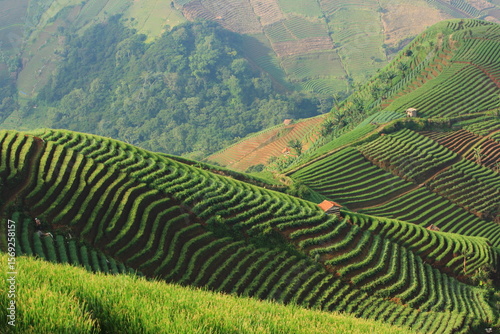 © mushofa, Fototapeta premium Scenic Green Terraced Farms on Hillsides of West Java, Indonesia – Aerial Landscape of Agricultural Beauty