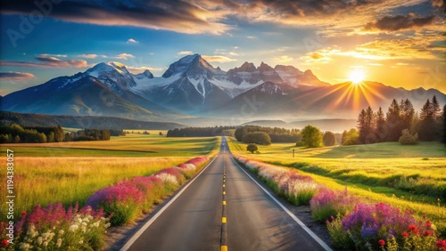 Fototapeta premium Scenic Highway Journey Through Vibrant Meadow Towards Majestic Mountain Peaks at Sunrise