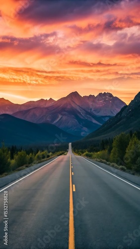 © MST BEGOM, Fototapeta premium Scenic Highway Leading to Mountains Under Vibrant Sunset Sky