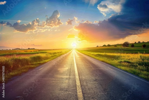 Fototapeta premium Scenic highway leads to a sunset-lit mountain range on an open road journey....