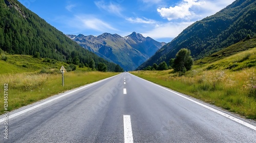 © Generative AI, Fototapeta premium Scenic highway stretching through lush green valleys and majestic mountains under a clear blue sky : Generative AI